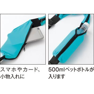 ウォーキングやジョギング時にぴったりの、伸縮素材のボディバッグ。小さく見えても、ポケット1つにつき500mlのペットボトルが入れられます。