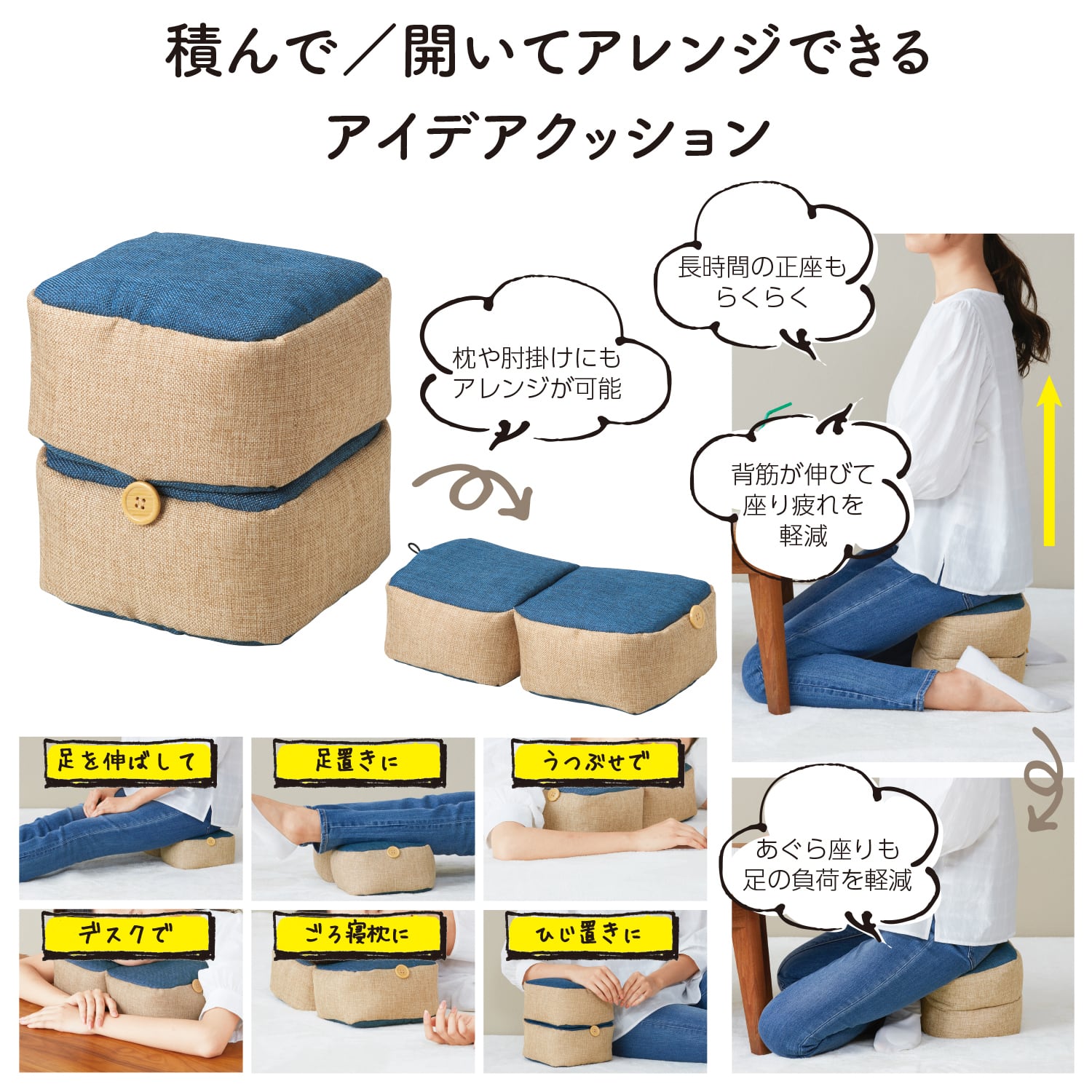 積んで、開いてアレンジできる様々な使い方ができるアイデアクッションです。