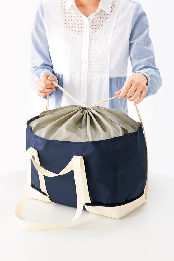小さくたためば持ち運びに便利♪ 巾着の口を閉じれば中身がこぼれません。