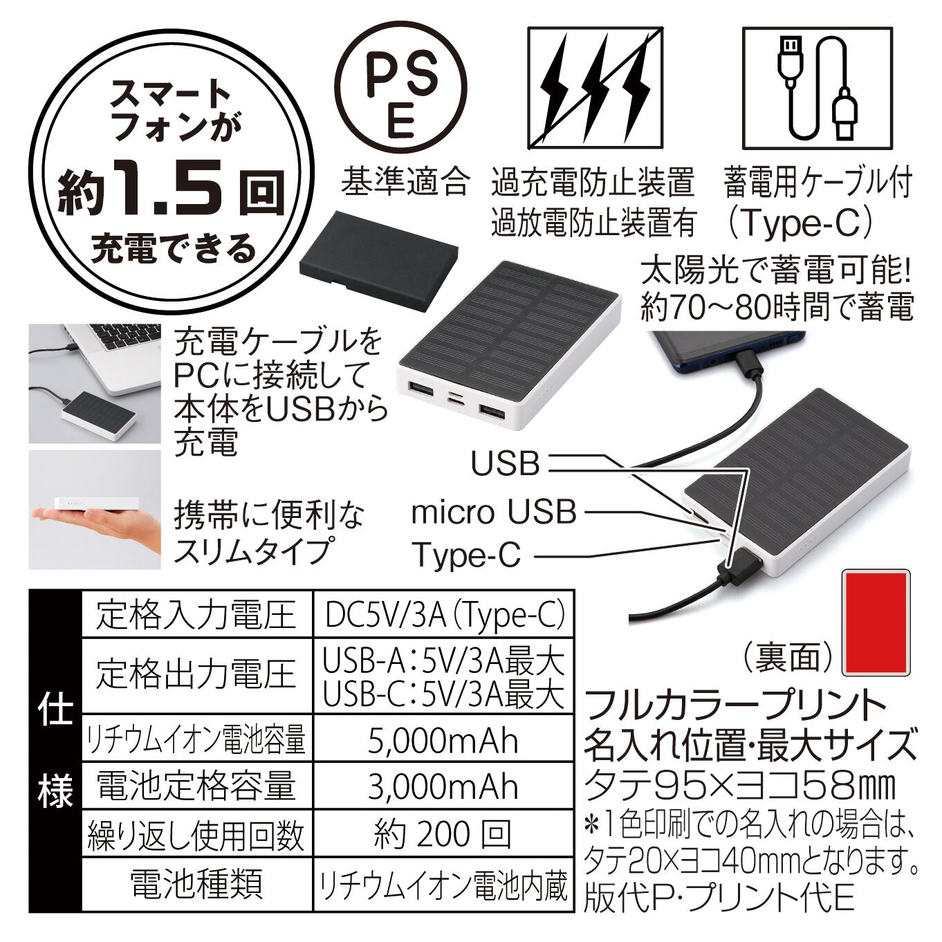 緊急時やアウトドアにも役立つソーラーパネルを搭載した、Cタイプ対応5000mA バッテリー。