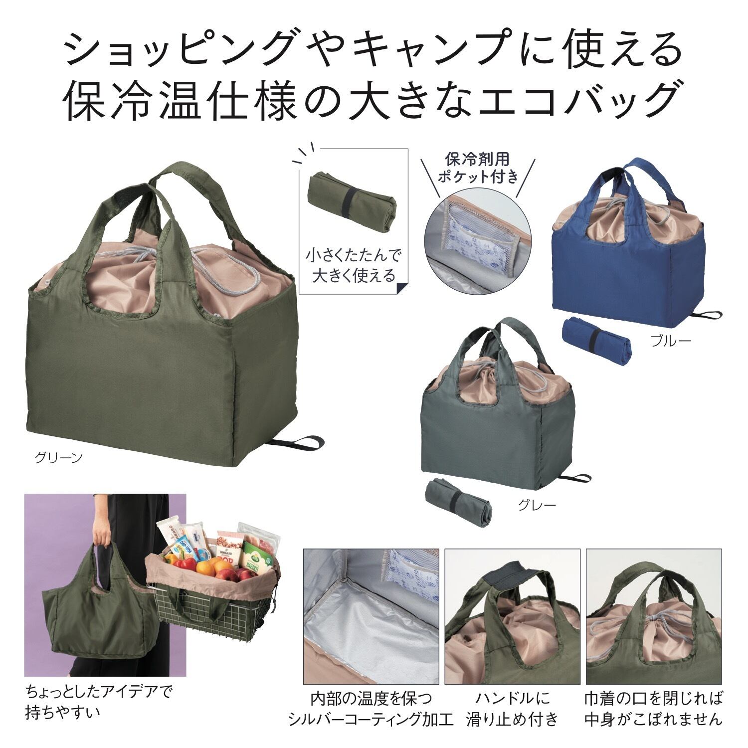 ショッピングやキャンプに使える、保冷温仕様の大きなエコバッグ。