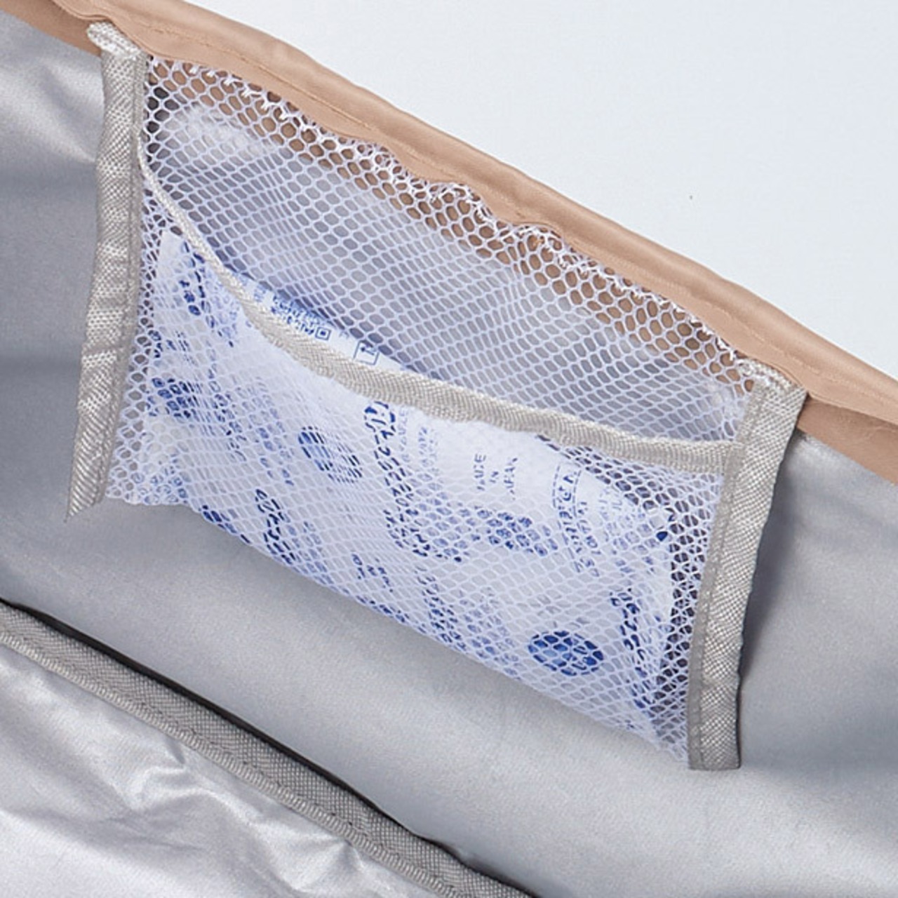内側はシルバーコーティングされているので温度を保ちやすく、保冷剤を入れられるポケットも付いています。
