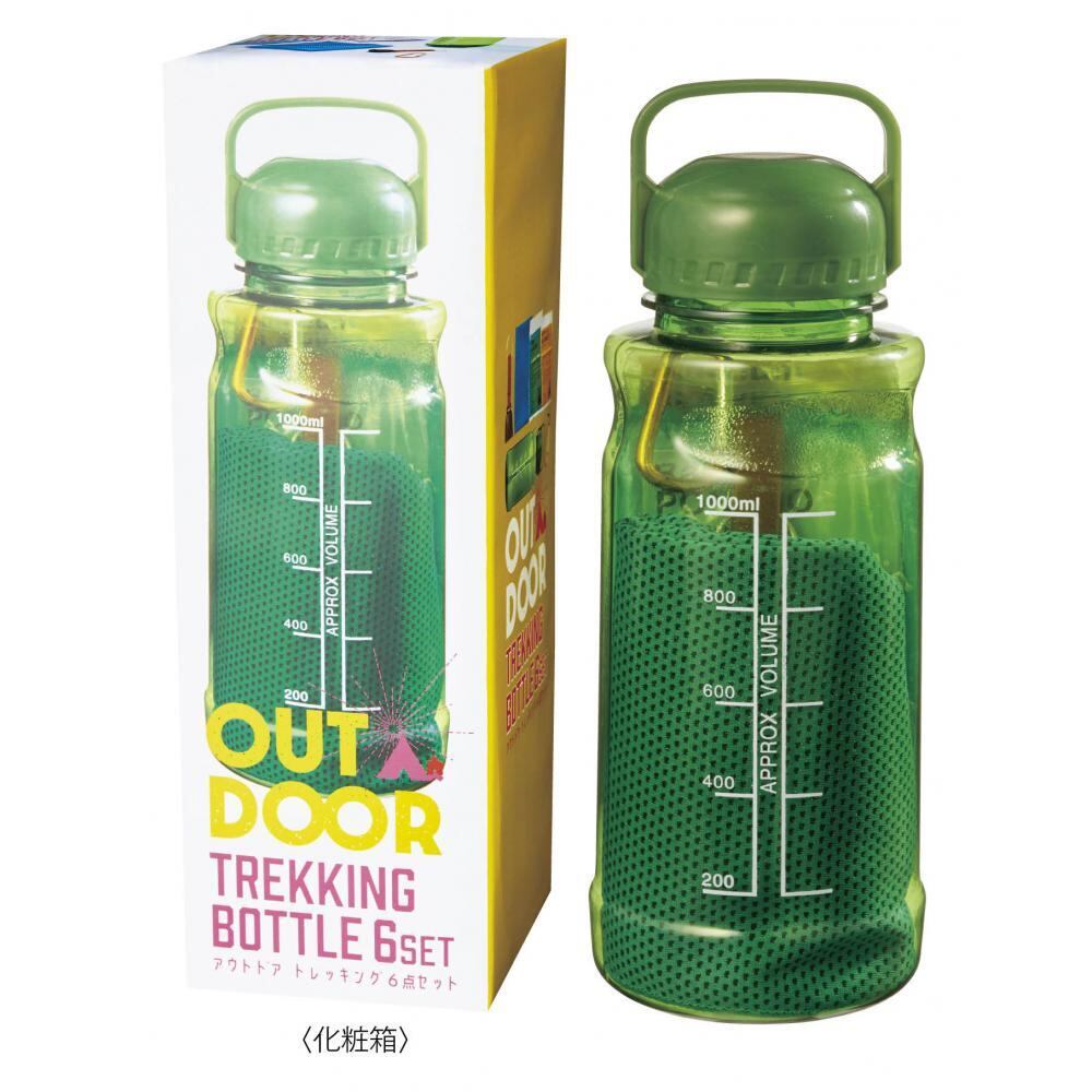大容量のボトルに「アルミブランケット」「レインポンチョ」「トレッキングベル」「涼感タオル」「カラビナ」がセットされたアウトドアシーンでの万能セットです。
