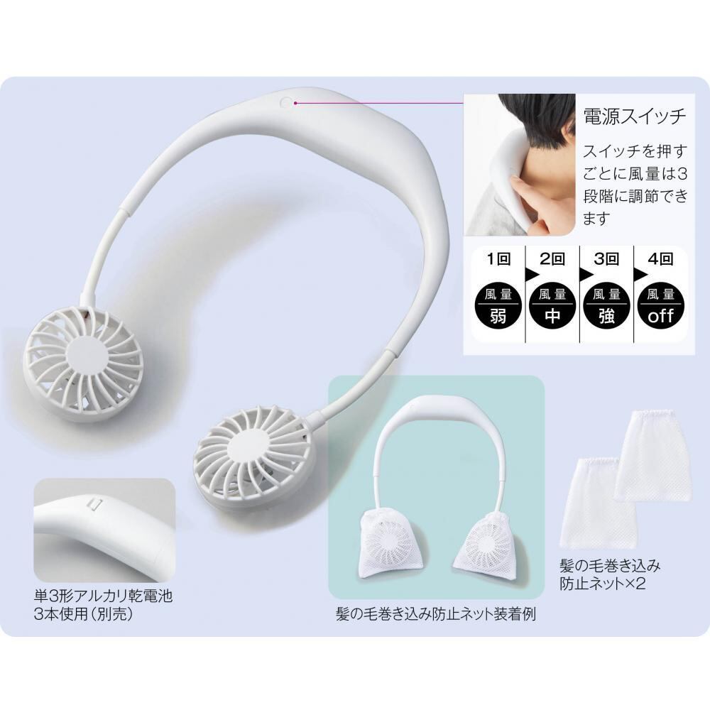調理時やテレワーク時に!風量の調整が3段階可能な首掛けタイプのファンです。
