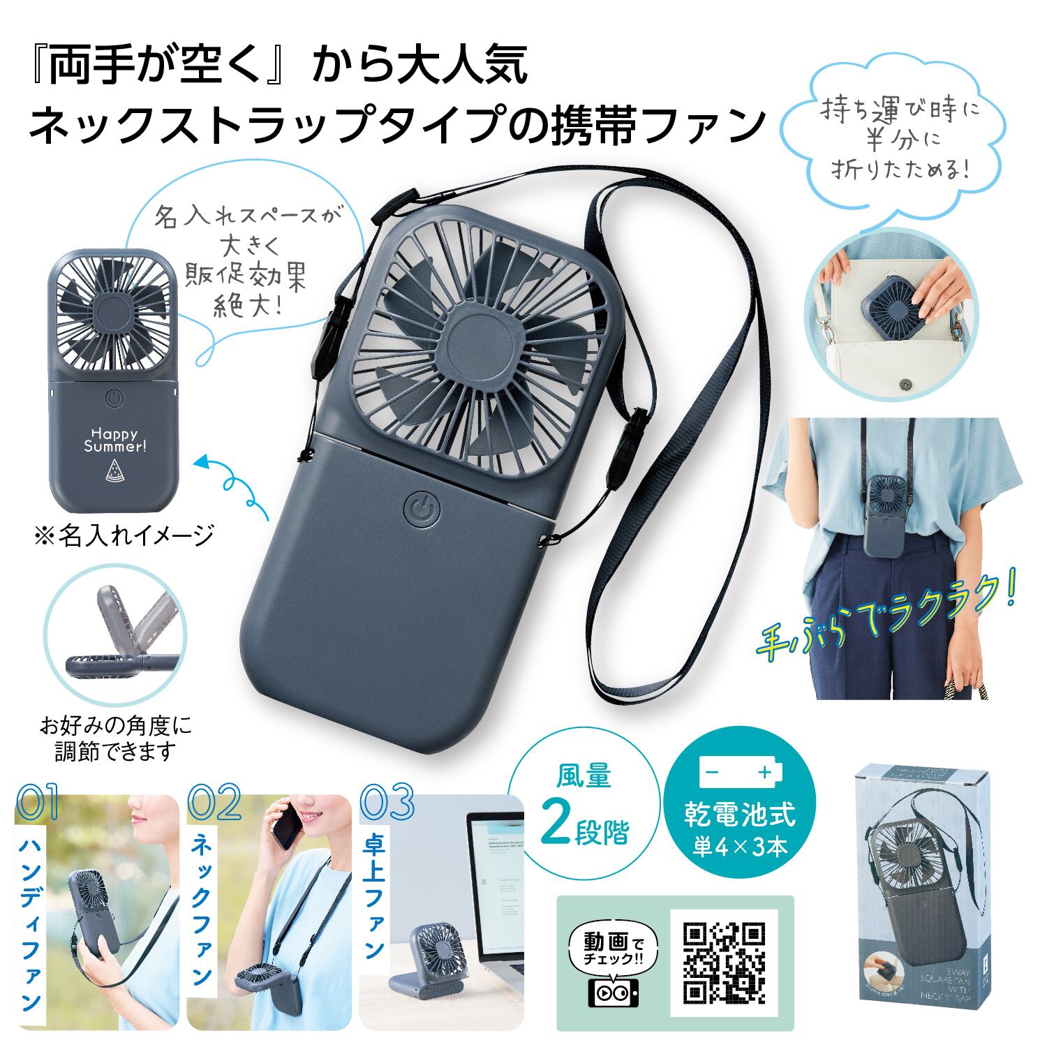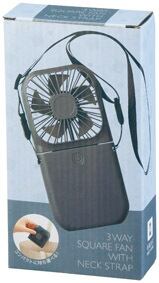 手ぶらで楽楽!ネックストラップ付 3WAY折り畳みスクエアファン