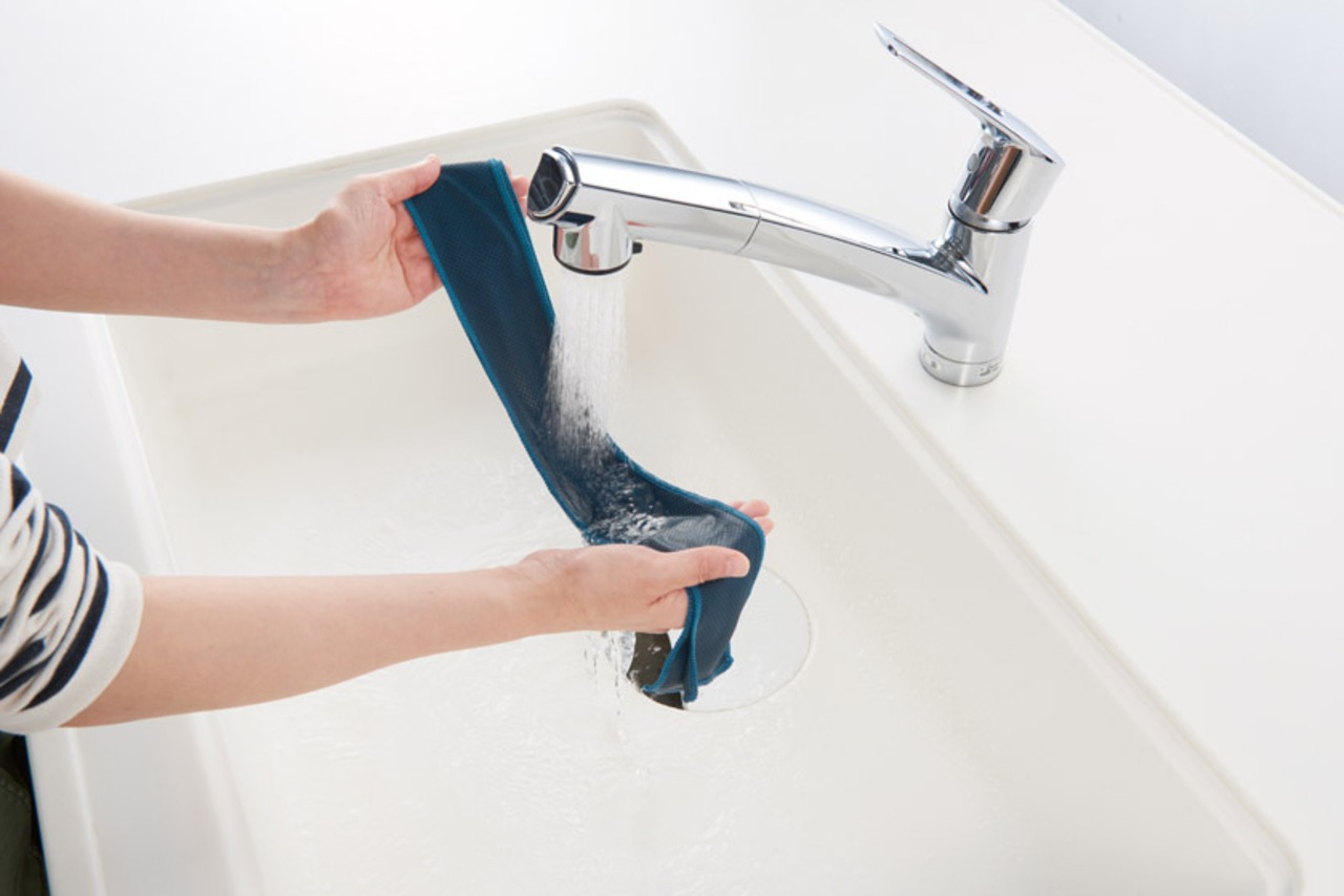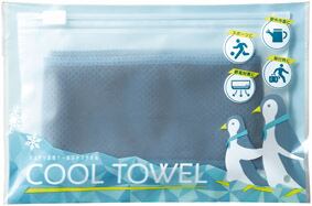水で濡らして絞るとひんやりした感触が楽しめる涼感タオル。