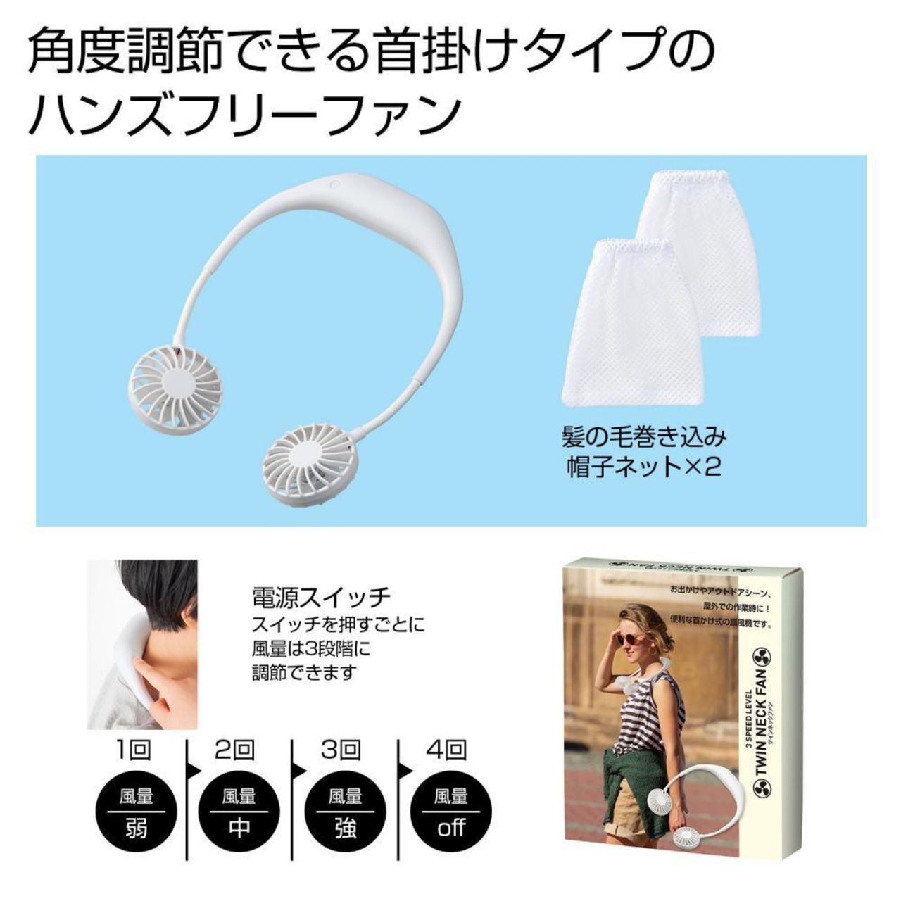 角度調節!使用中に両手が使える、首掛けタイプ【ハンズフリーツインネックファン】
