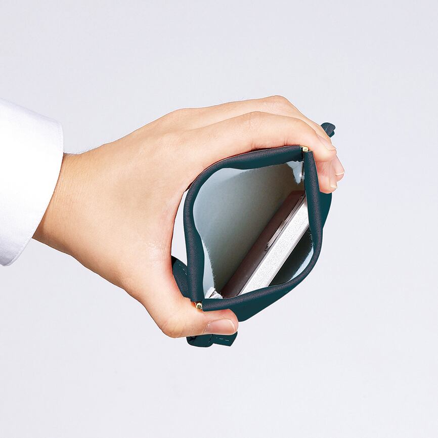 レザー調素材で高級感を演出、開口部はばね金具仕様なのでワンタッチで片手だけで開封できます。