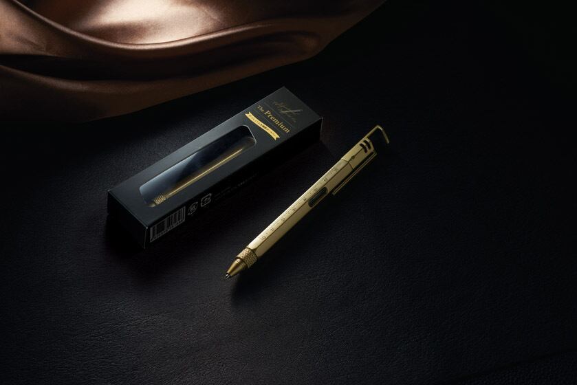 黄金に輝くマルチ機能ボールペン。その高級感ある外観は、パッケージも含めてSNS映えもするデザイン。