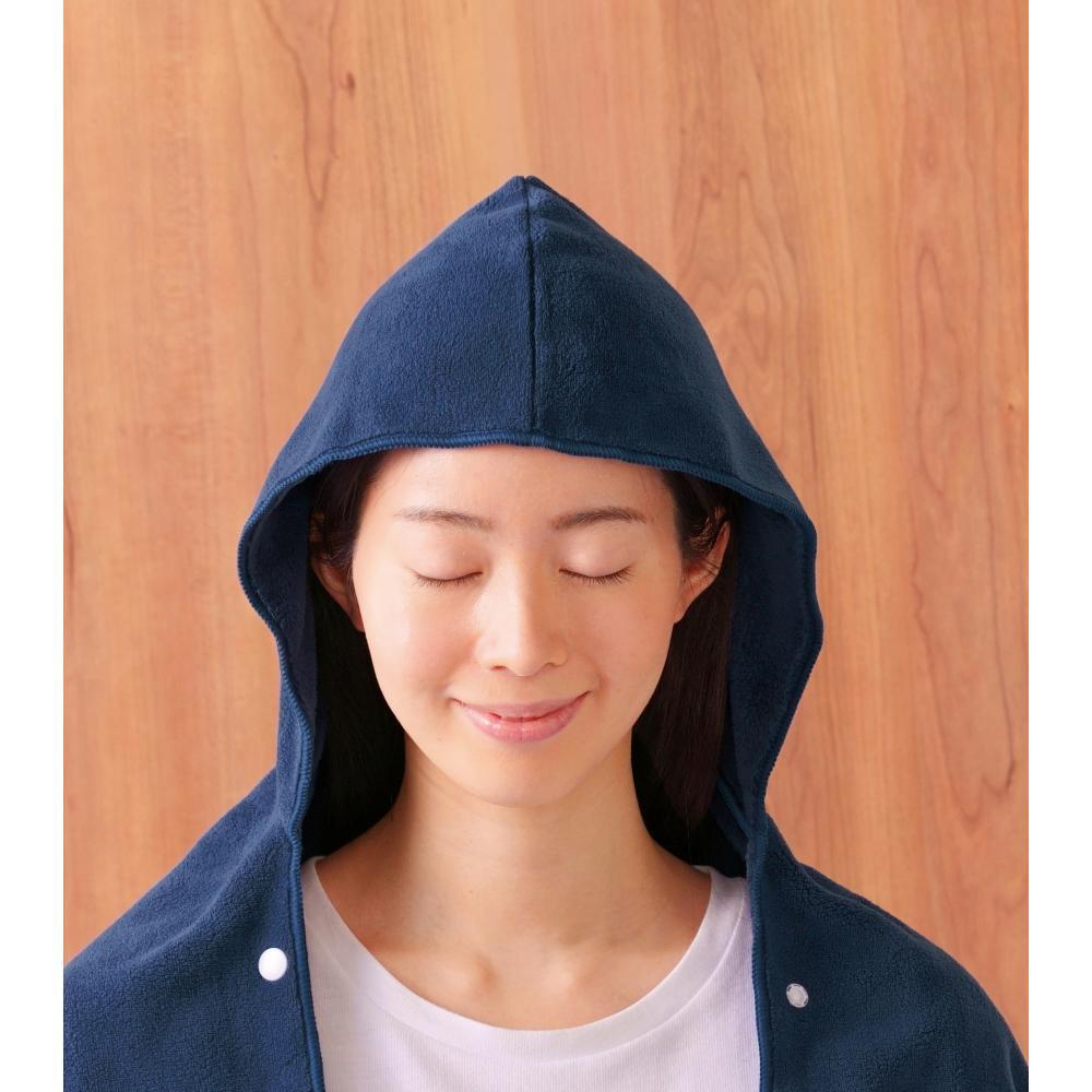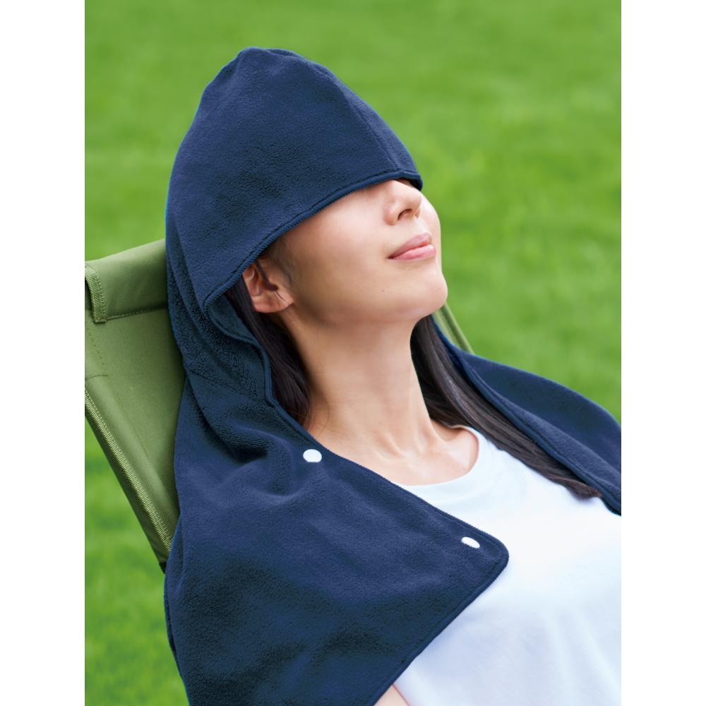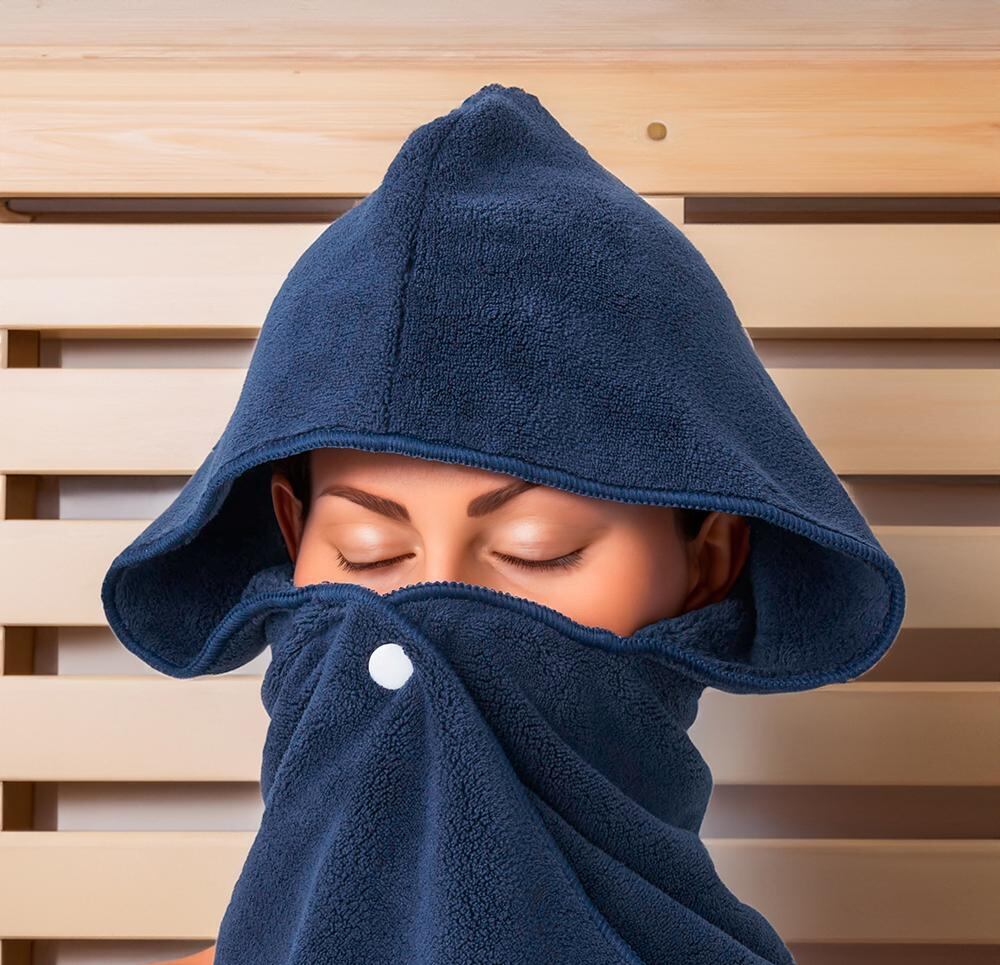 サウナ内の乾燥から肌や髪をやわらかな手触りで守り、スナップボタンで調整可能。