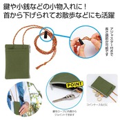 アジャスター付きのロープで首から下げることができて、お散歩やお出掛け、社内移動時だけでなくアウトドアレジャーや野外フェス、