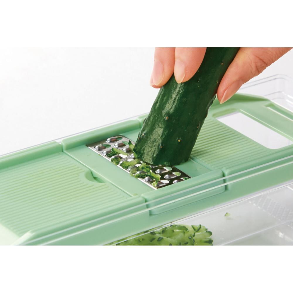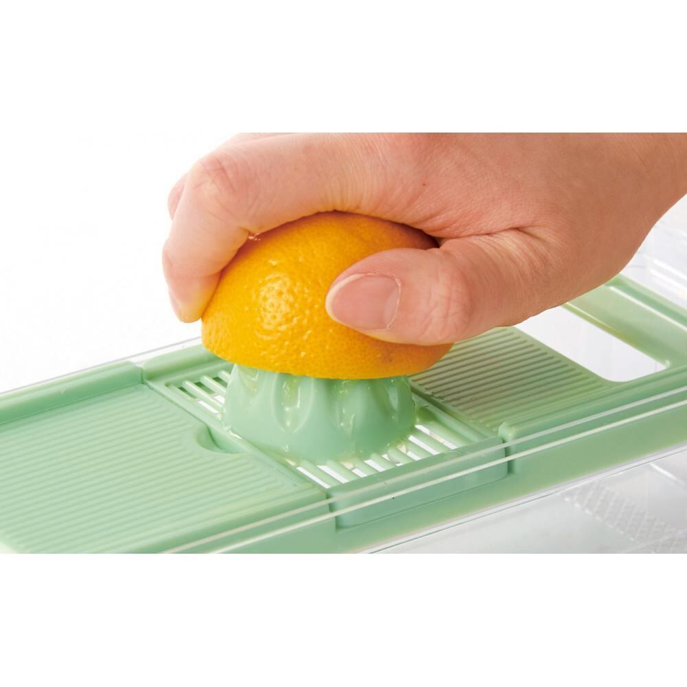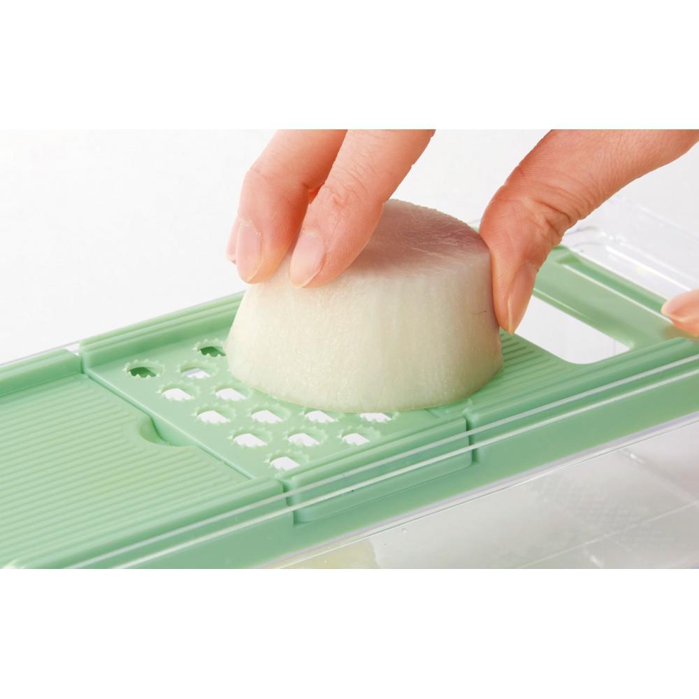 アタッチメントを取り換えるだけで「おろし」「しぼり」「スライス」「千切り」「つま切り」5種類ができる調理の時短アイテムです。指をケガしない安全ホルダー付き。キッチンになじむグリーンがさわやかです。
