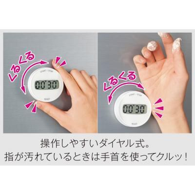 清潔感があり、名入れも目立つホワイトのタイマー。料理中に手指が汚れていても、手の側面や手首を使ってくるくるできます。裏面は幅広のマグネット付きなので冷蔵庫にもしっかり付きます。