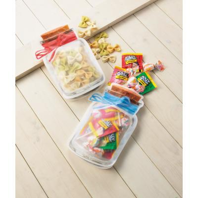キャンディーやクッキーなどを入れるとまるで本物のガラス瓶に入っているように見えるスタイリッシュなジッパーパック。持ち歩き用としても便利です。